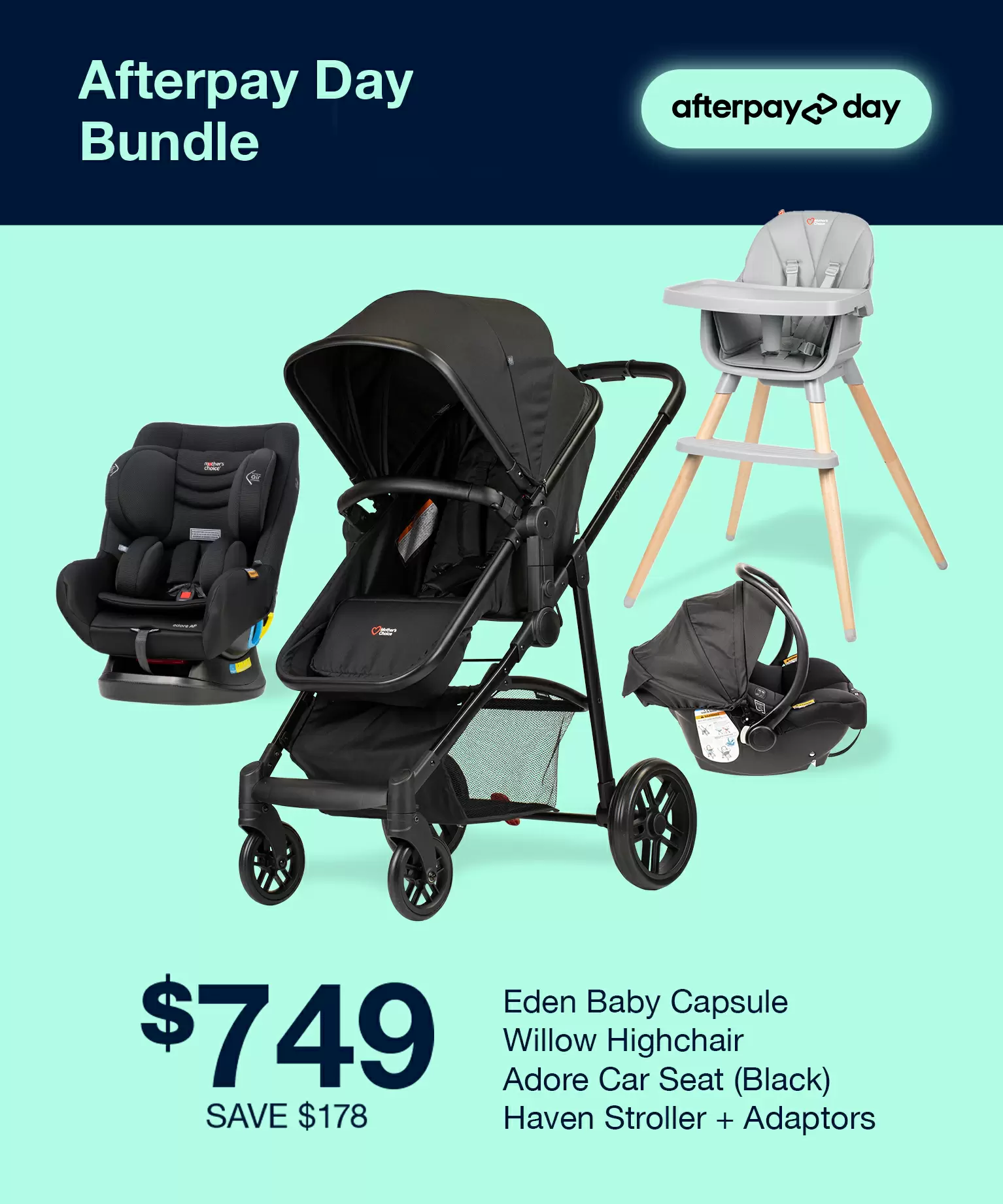 Travel System BundleTravel System Bundle includes everything you need from day one to the big kid stage- featuring the Mother’s Choice Ascend car seat 0 to 8 years, Haven 3-in-1 bassinet stroller, Baby Capsule and adaptor. Designed to support your growing family every step of the way.In StockA$799.00 Regular Price A$1,486.99You save A$687.99 -